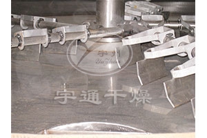 濕物料自加料器連續地加到干燥設備的第1層盤上,帶有耙葉的耙臂做回轉運動,使耙葉連續地翻轉物料,物料沿著指數螺旋線流過干燥盤表面,在低干燥盤上的物料移到外緣,并在外緣降落到下方的高干燥盤外緣,在高干燥盤上的物料向里移動并從中間落料落入下一層低干燥盤中,高低干燥盤上下交替排列,物料得以連續地流過整個干燥設備,中空的干燥盤內通入加熱介質,加熱介質從一端進入另一端導出,已干燥物料從最后一層干燥盤降落到殼體底層,最后被耙葉移動到料口流出。蒸發出來的蒸汽經設置在頂部的排濕口流出,溶劑經冷凝器收回后經真空泵流出室外。底部流出的干物料冷卻后直接包裝。